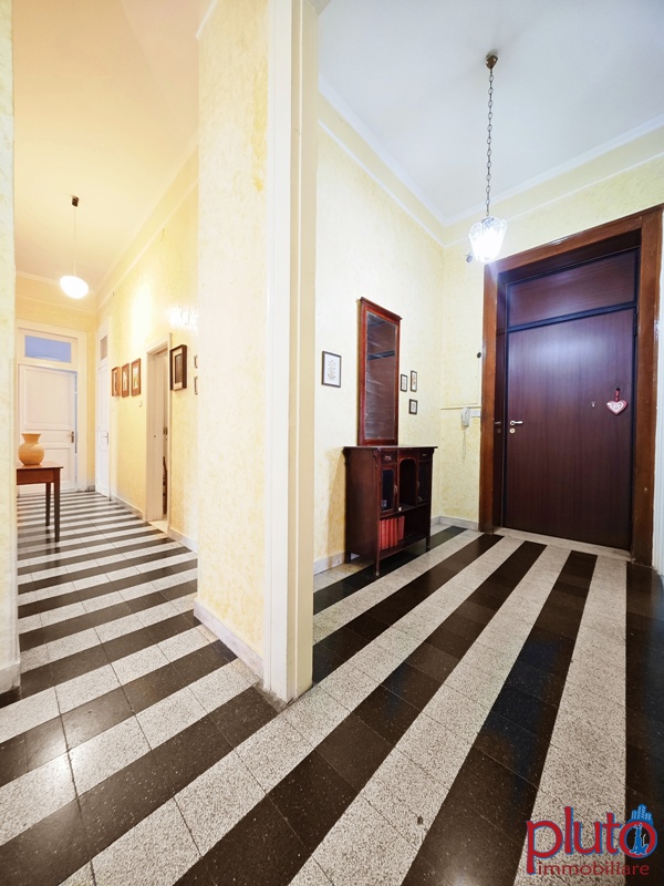 Il grande ingresso ci conduce ai due disimpegni che ci permettono di accedere a tutti i vani presenti in casa: allo spazioso studio, al salone doppio, alle tre camere da letto, ai due servizi e alla cucina.