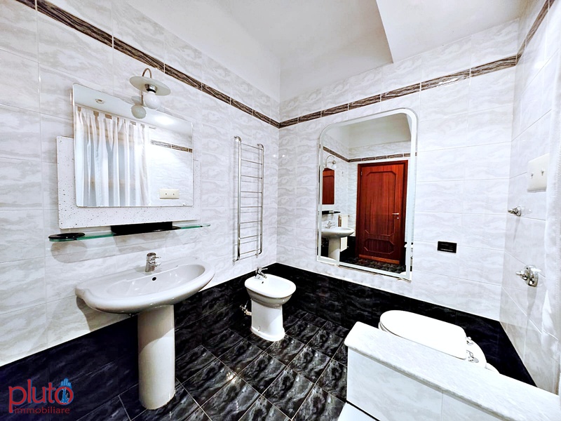 L'ingresso principale ci conduce direttamente al luminoso salone doppio, servito da un terrazzo a livello dal quale si vede il mare, al disimpegno, nel quale troviamo la cucina abitabile con il balcone ed un ripostiglio esterno, il bagno e lo studio. L'altro disimpegno ci immette direttamente al corridoio, nel quale troviamo il secondo ingresso, due ampie camere da letto,di cui una con la cabina armadio ed un lungo balcone a servire le due camere.